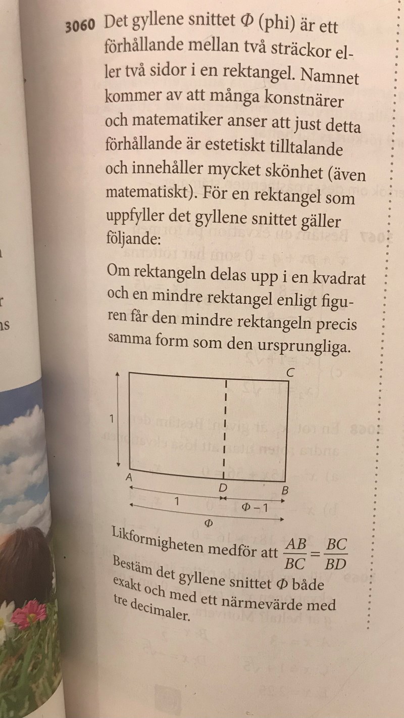 Texten säger att den lilla rektangeln har "samma form" som den stora rektangeln vilket matematiskt betyder att den lilla rektangeln är likformig med den stora rektangeln, så att kvoten är densamma för den lilla rektangeln och den stora rektangeln.