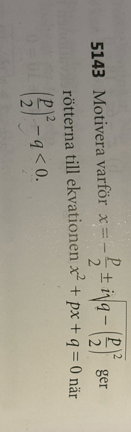 Jag började med att ställa upp och får fram att q > p2/4, och då tänker jag att talet under rottecknet blir positivt vilket i sin tur ger två reella lösningar, men därefter har vi det imaginära talet i som stör.
