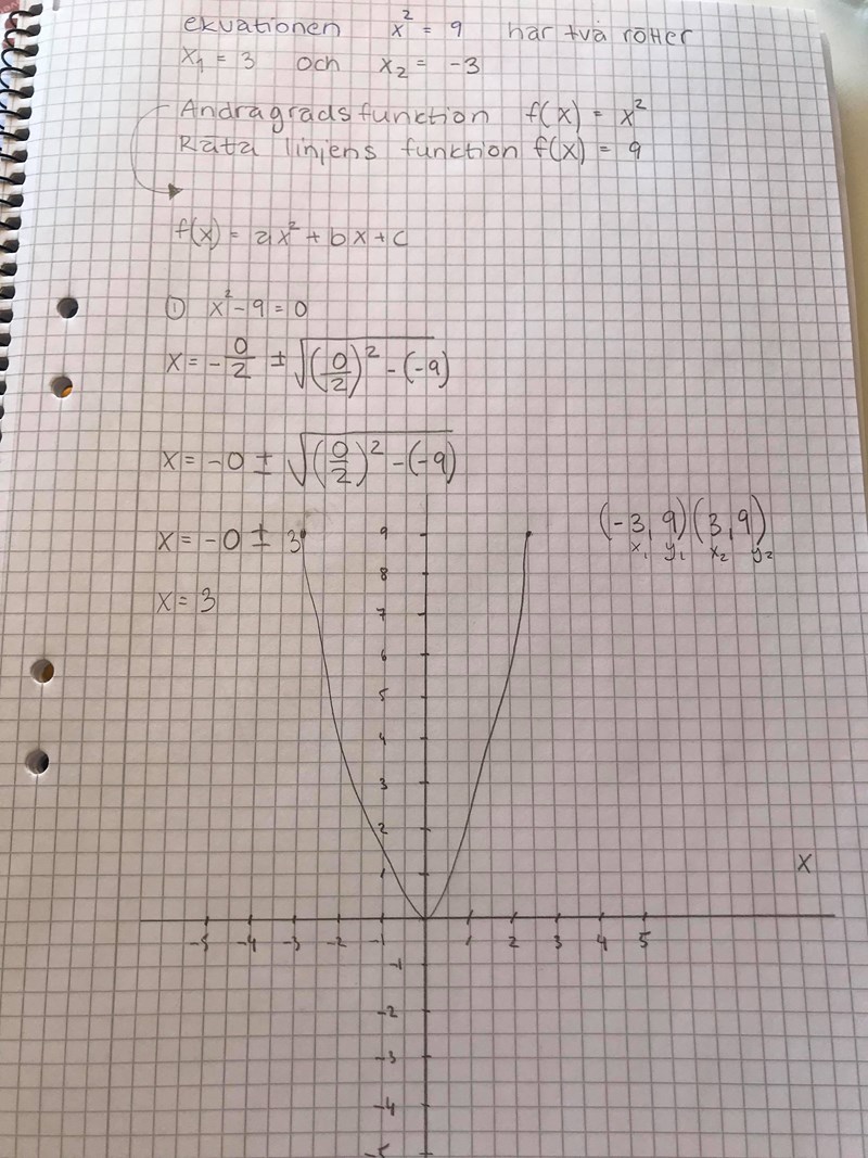Ekvationen x^2=9 har två rötter, x1=3 och x2= - 3. Rita en graf till andragradsfunktionen f(x)=x^2 och till räta linjens funktion f(x)=9 på ett papper. Förklara varför det finns två rötter till ekvationen med hjälp av grafer. Ta bild med din mobil och klistra in i Google.docset.