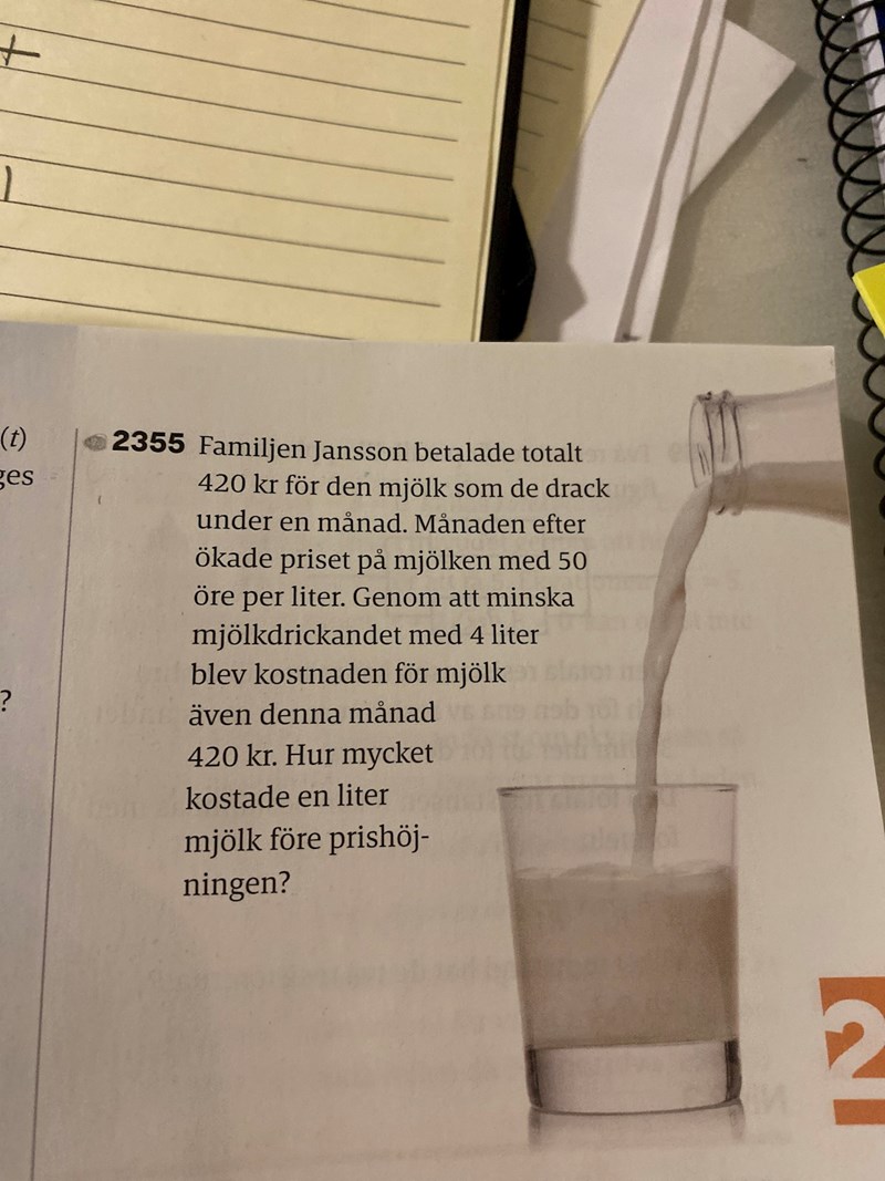 Jag har suttit fast på denna C-uppgift länge och förstår inte varför jag inte kan komma på hur jag ska göra. Kapitlet handlar om andragradsekvationer. Kan jag inte skriva det som ett ekvationssystem: xy=420 där x är liter mjölk och y är kronor/ litern. Den andra ekvationen borde då vara: 420=(x-4)(x+0.5)