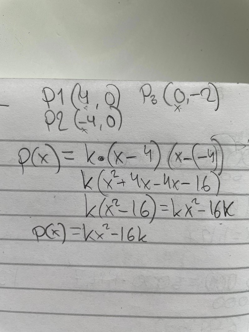 Okej är med på vad du menar, men kan du utveckla vad du menar med p(x)=k·(x-x1)(x-x2)·...·(x-xn) vad står det ensamma xet för? Eller xn? För om man använder sig av punkten (0,-2) blir hela uträkningen 0?