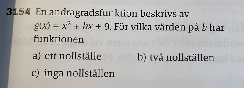 Hej! jag vet inte riktigt hur jag ska gå till väga för att få svaret. När jag gjorde så satte jag in g(0) men då försvann b. Enligt facit är svaret +- 6 (på a)