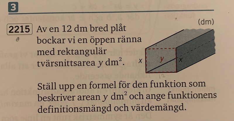 Ser du att det är en plåt som ligger på botten, och på höger- och vänstersidan har man vikt upp en kant som har höjden x. Den delen av plåten som ligger kvar på botten kan vi kalla b. Då vet vi att b+2x = 12 dm (det framgår av de två första raderna) och att tvärsnittsarean x.b = y dm2 (det står på rad 3 och 4).
