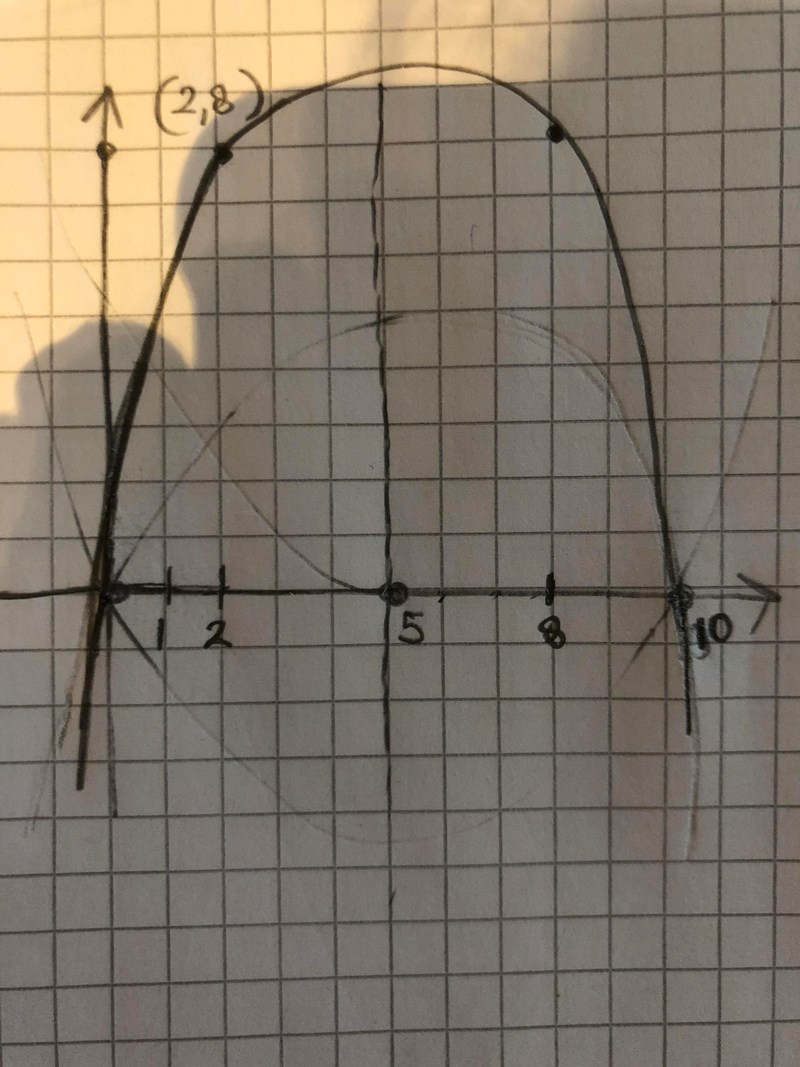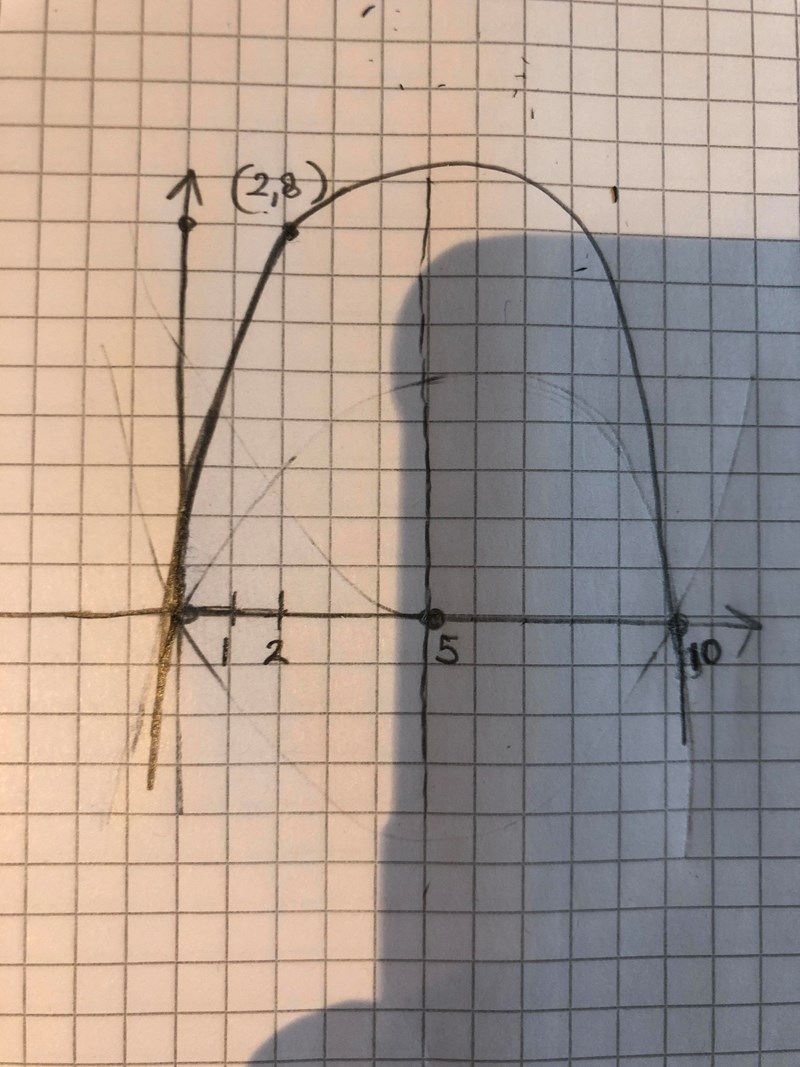 Såhär? Jag antog att eftersom symetrilinjen är x=5 så kan nolllställena vara ex 0 och 10, samt försökte se till att den gick igenom f(2)=8