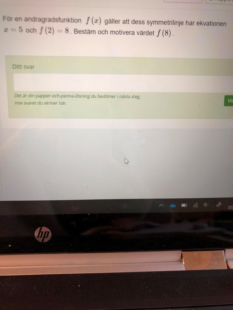 Du har fått ekvationen för f(x):s symmetrilinje, samt dess värde i en viss punkt. De vill att du använder denna information för att hitta värdet av f(8). :)