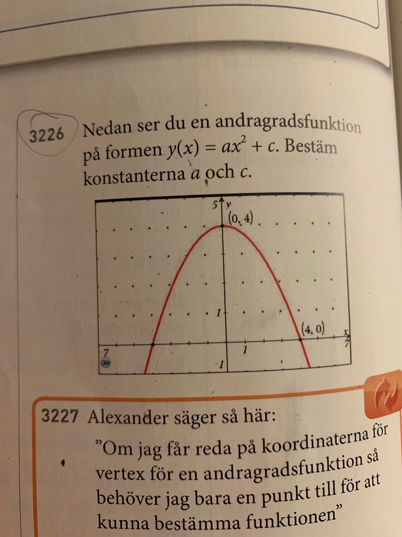 När vi nu vet c kan vi skriva vår funktion med c = 4, då blir den: . Här kan vi nu stoppa in den andra punkten () på samma sätt, och räkna ut a. Det låter jag dig testa själv med, men hojta om du kör fast! :)