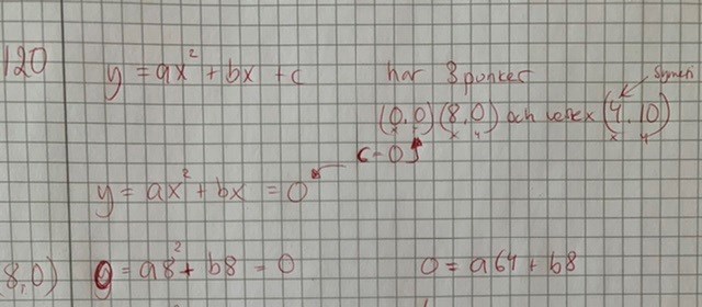 Du har utnyttjat att grafen går genom (8:0) till att komma fram till ekvationen 0 = 64a + 8b