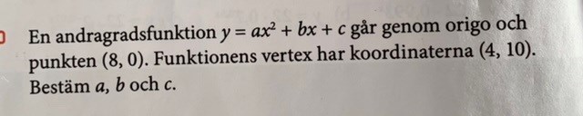 Nu kan du slutligen utnyttja att grafen går genom (4,10) och sätta c=0, b=-8a och får då en ekvation i bara a - att lösa
