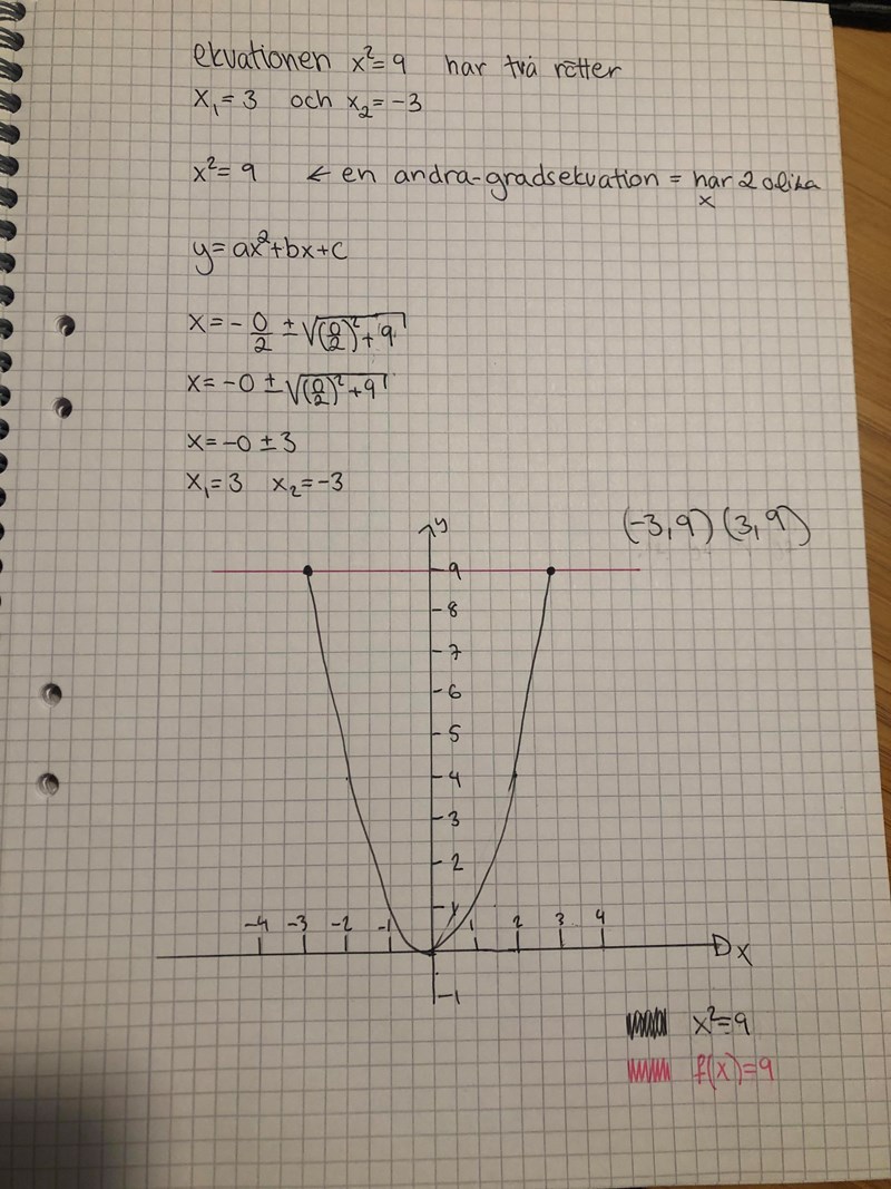 Ekvationen x2=9 har två rötter, x1=3 och x2= - 3. Rita en graf till andragradsfunktionen f(x)=x2 och till räta linjens funktion f(x)=9 på ett papper. Förklara varför det finns två rötter till ekvationen med hjälp av grafer.