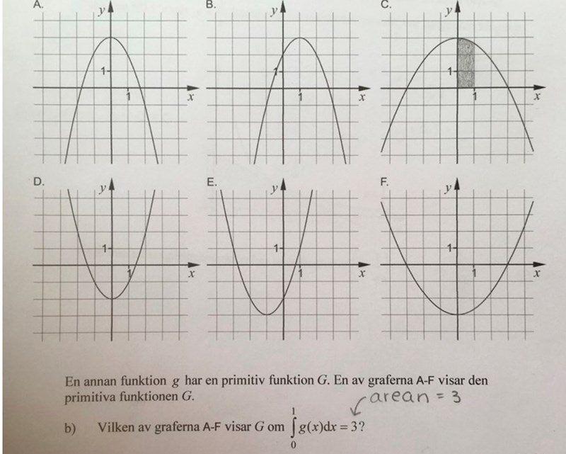 Nja, arean under g(x) skulle vara 3 men nu vill de veta vilken som är den primitiva funktionen G. Kom ihåg att om G är en primitiv funktion till g så gäller det att den där integralen är = G(1) - G(0). I vilken bild stämmer det att G(1) - G(0) = 3?
