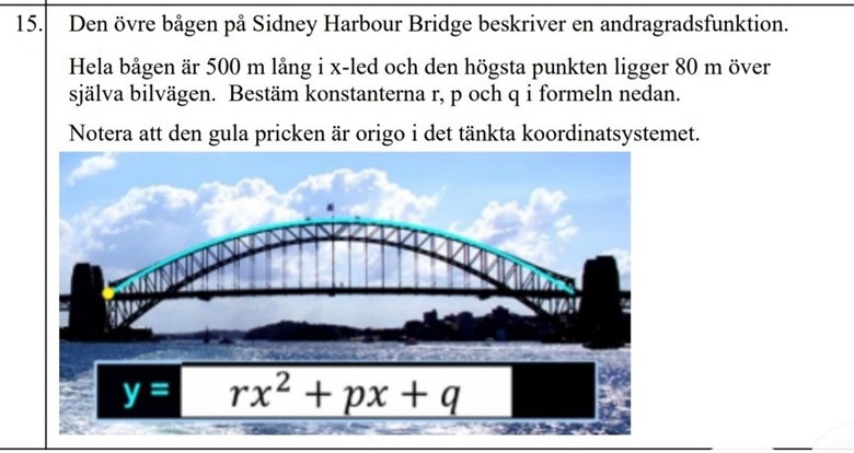 Maximipunkten för grafen blir då (250,80) för om den ligger 80meter över bilvägen kommer x vara Xsym vilket man tar från nollställerna x1= 0 x2= 500 adderar och delar på 2