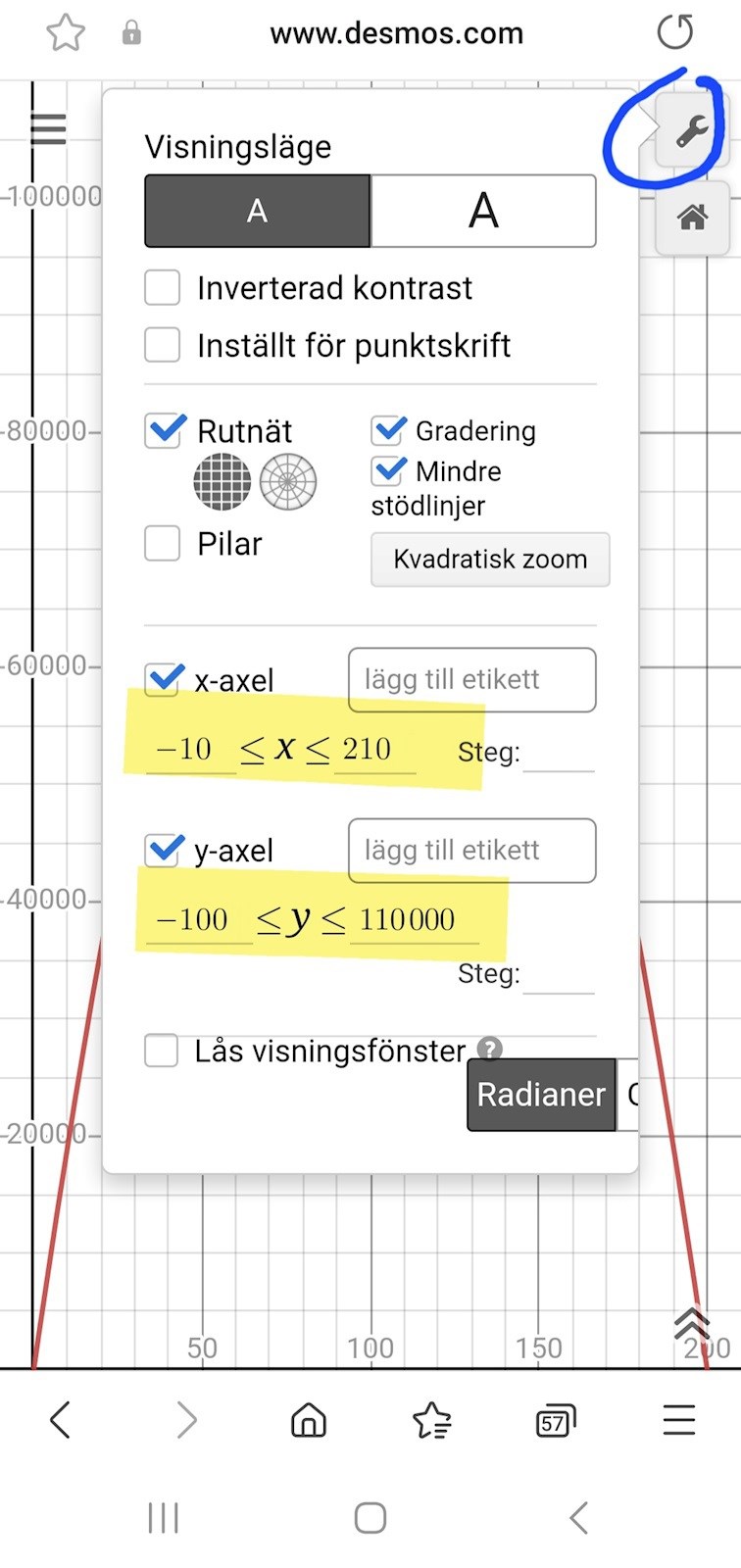 Jag försökte göra det på Geogebra men fick en konstig graf som inte var alls lik den i facit. Jag skrev i inmatningsfältet