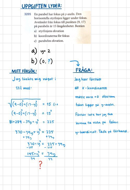 Här kan du läsa om fokus och styrlinjer: https://www.matteboken.se/lektioner/matte-2/geometri/parabelns-ekvation