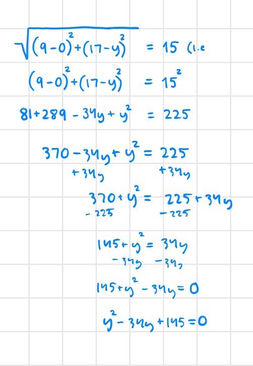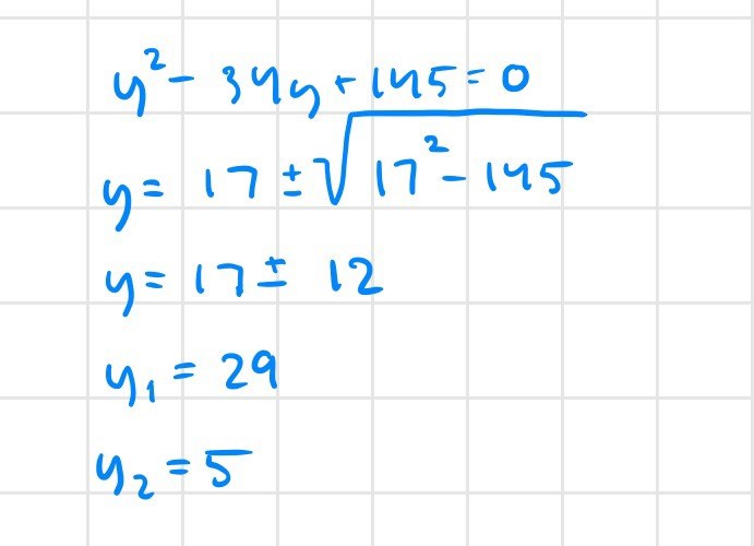 Du har fått fram andragradsekvationen 370-34y+y2=225 eller y2-34y+145=0.