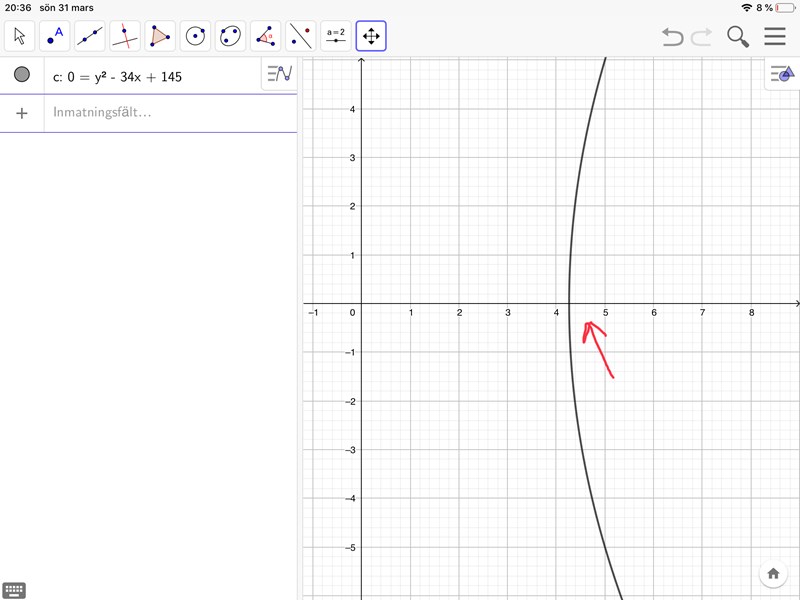 Jag gjorde om det till en andragradsekvation, 0=y^2-34y+145, men förstår mig inte på hur jag ska lösa den. Jag gjorde ett försök i GeoGebra men förstår inte vad det är jag ser på. Dessutom vill jag veta hur jag löser det algebraiskt. Försökte läsa på mattecentrum vad det innebär att lösa en andragradsekvation, men utan framgång.