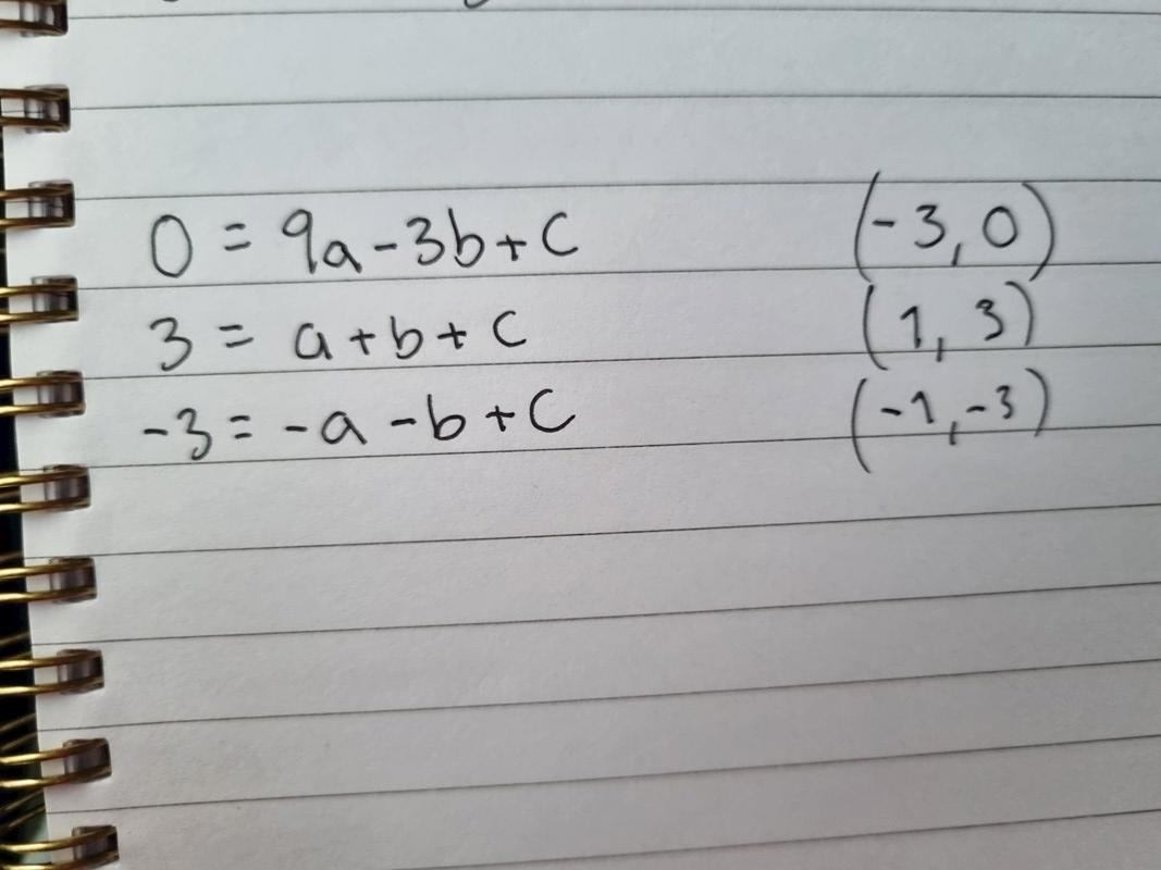 Du har ju räknar ut koordinaterna för tre punkter; (-3,0), (1,3) och (-1, -3). Rita in de tre punkterna i ett koordinatsystem och lägg upp bilden.