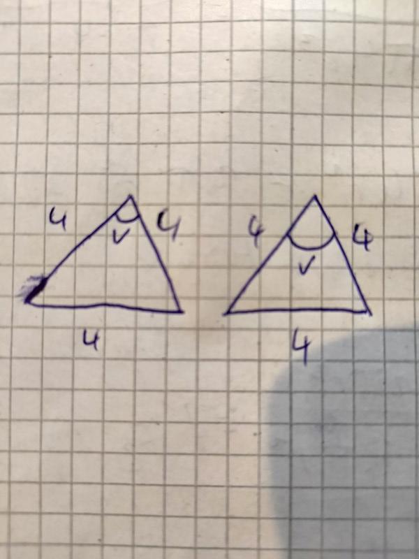 Låt säg att alla sidor i trianglarna hos båda trianglarna är 4cm, då all vinklar konsekvent blir 60 grader, om jag ritar en större halvcirkel för v i den andra triangeln, är den fortfarande 60 grader den vinkeln?