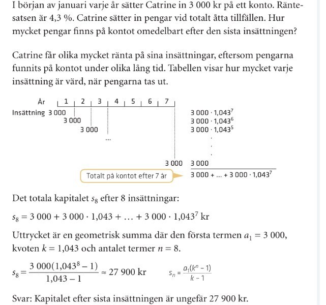 Här behöver vi först ta reda på hur stort beloppet har blivit när det vuxit med 7 % ränta i 3 år. Sedan skall detta belopp (plus ränta) betalas in i 5 lika stora inbetalningar. Då vet vi att och att . Då får vi formeln