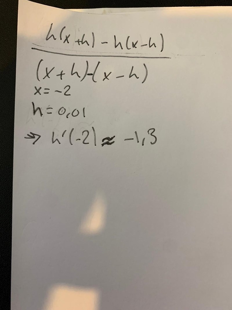Knepet här är att ställa upp valfri differenskvot och sedan iterera beräkningen av närmevärdet för gradvis minskande värden på h, tills de tre första decimalerna inte längre ändrar sig.
