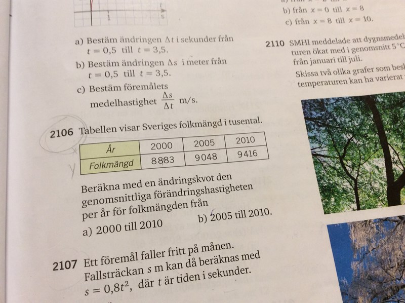 Här har vi fråga 2106. Jag hittade medelförändringen och den är 53.3 i fallet a, men frågan är om skillnaden per år. I Facit står det 53 300 pers per år. Då förstår jag att man ska gånga med 1000 men förstår inte meningen varför 1000?