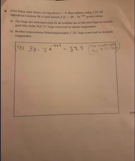 Du har ställt upp en ekvation som, om du löser den, ger dig tidpunkten t då resultatet avviker med en tiondels grad från 38°.