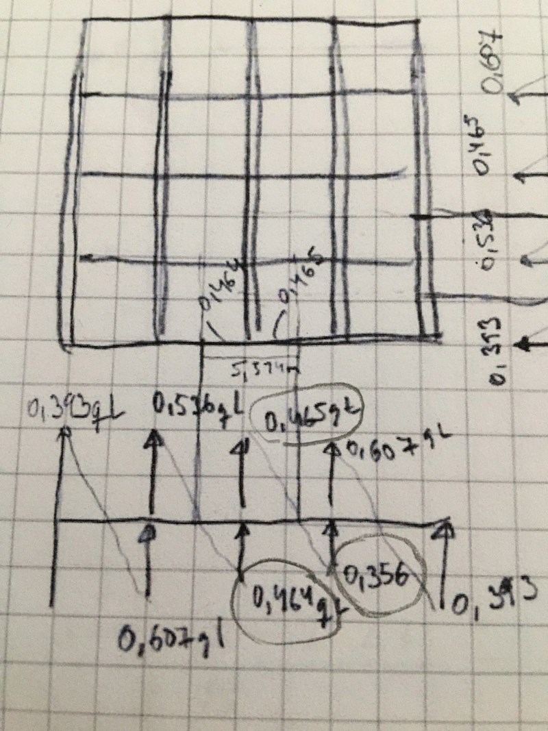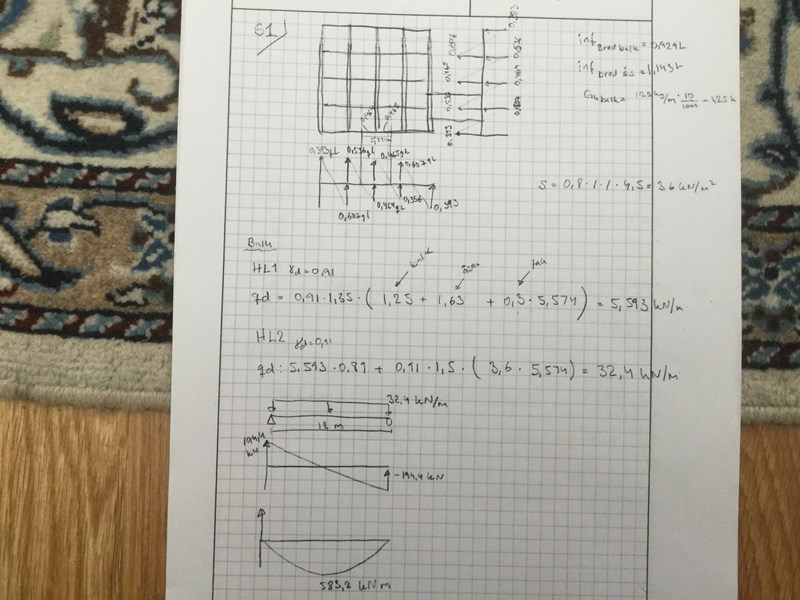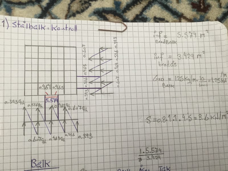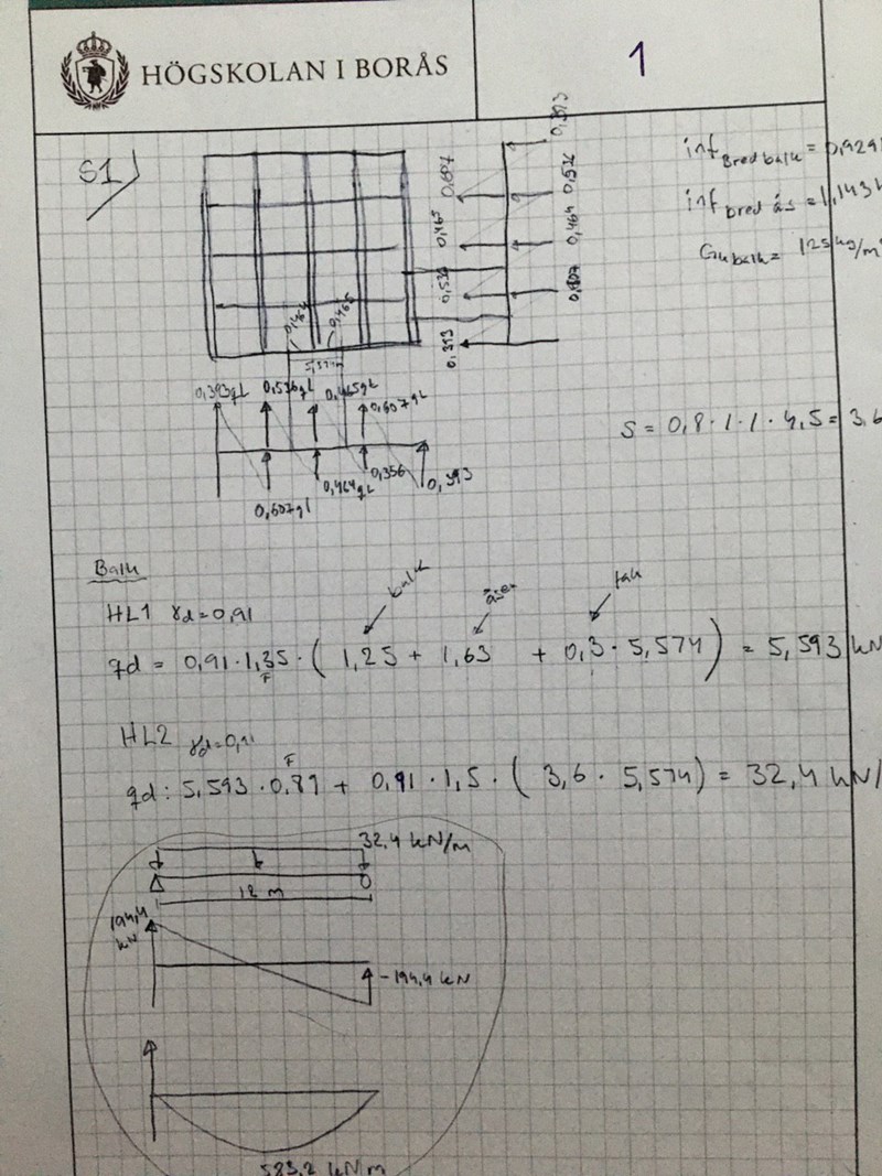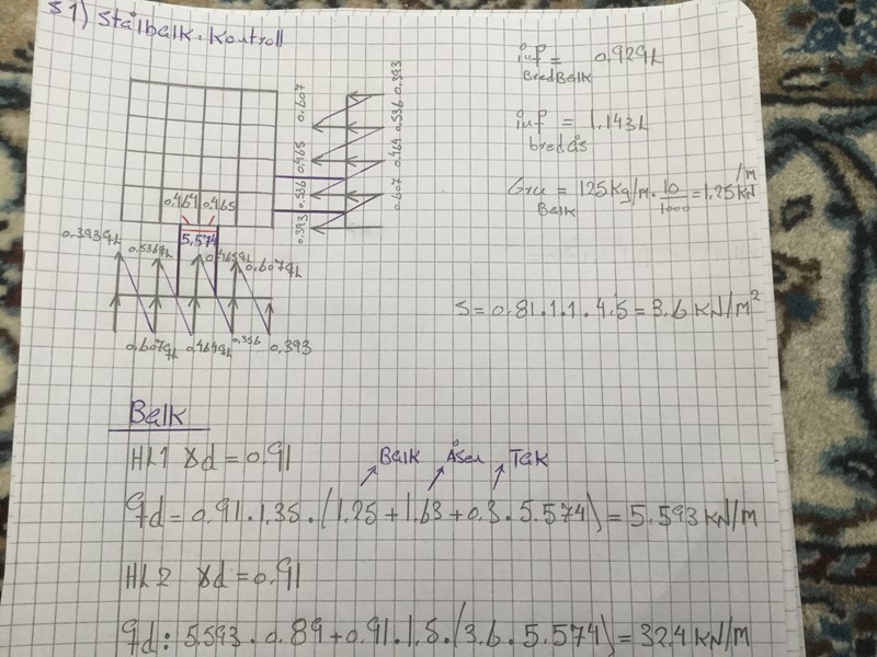 Hej .jag gjorde så när jag räknade ut dessa värde så 0,393 från boken eller Tabell .om man tar 1- 0,393= 0,607 .Sen tar man 1,143- 0,607= 0,536.Sen tar man 1- 0,536= 0,464 och sen tar man 0,929-0,464= 0,465 .hoppas det är rätt tänkt Conny.om du tittar på HL 1 och HL 2 eller qd som betyder Variabellast,så har vi 32,4 KN/m.Det är den last mängden som vi har fått.