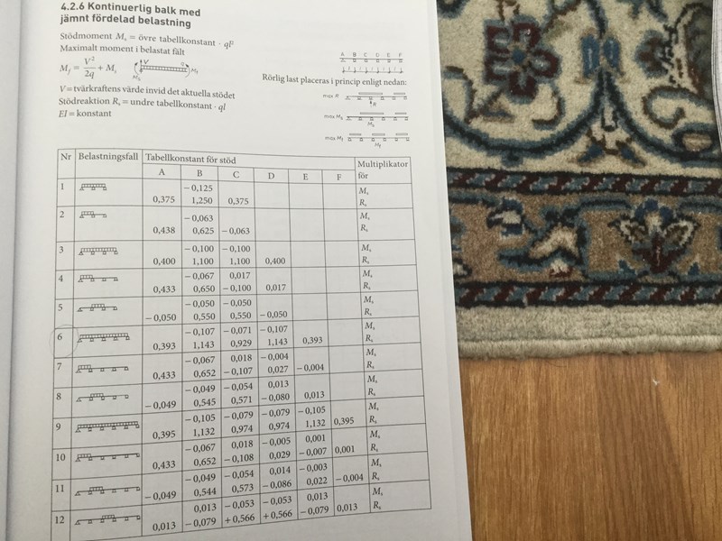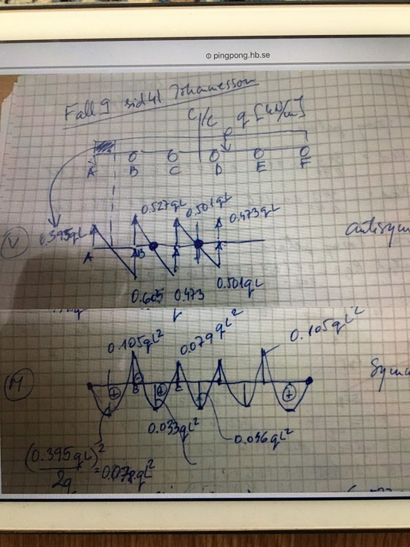 Hej conny.Tack för ditt svar.Det är en lösning som skolan lägger ut och vi som elever för öva på den.Nu har boken som heter Byggformler och Tabeller kommit.den sidan jag lägger ut Dvs fall 6 står det vad man skall göra.jag har räknat ut alla värde .om vi börjar från vänster sida från figuren så ser du 0,393 qL det stämmer nästa värde om man tar -0,107/2 = 0,536 ql det stämmer oxå. 0,929/2= 0,465 ql stämmer oxå. Nästa som är 0 607 ql stämmer inte.