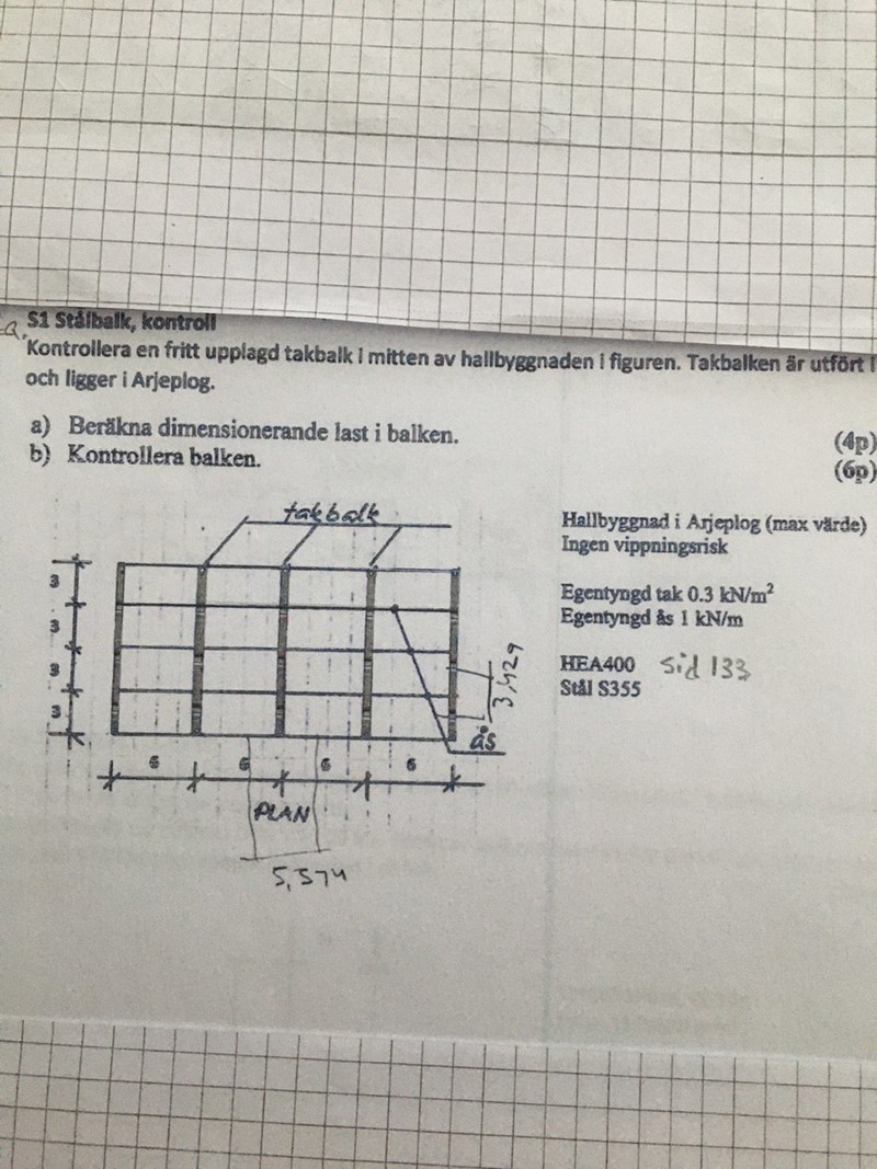vi skulle kontrollera en fritt upplagd takbalk i mitten av hallbyggnaden i figur.Takbalken är utförd i HEA400 och ligger i Arjeplog