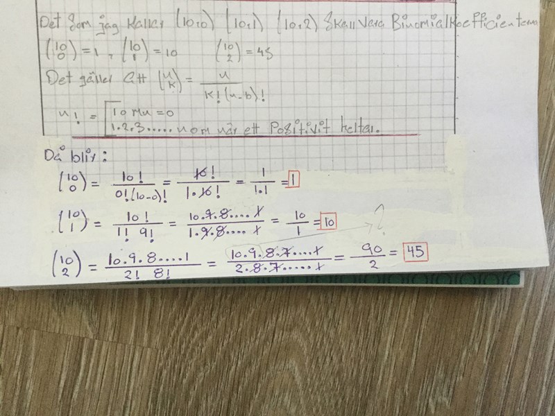 kvoten är 10!/2!8!, men 10! är ju 10*9*8*7... så du kan skriva det som 10*9*8!/(2!8!) och 2! är ju bara 2 så du har 10*9*8!/(8!*2), förkorta 8! så har du 10*9/2= (5*2*9)/2=5*9=45.