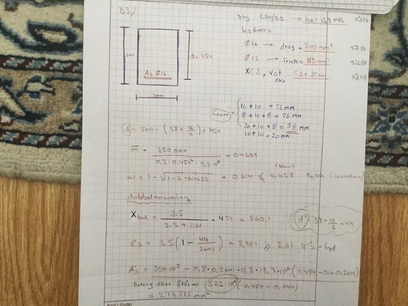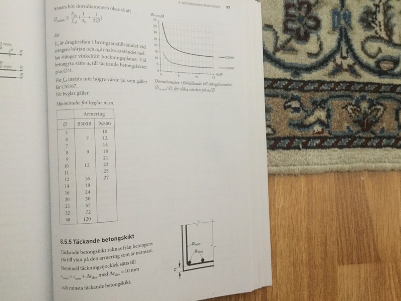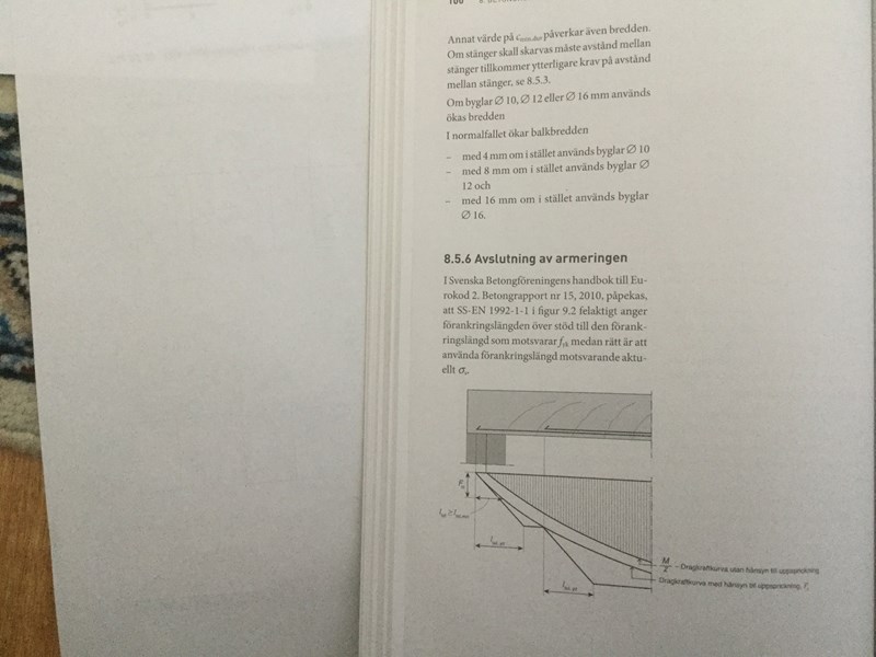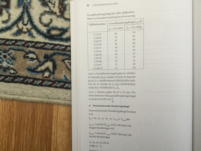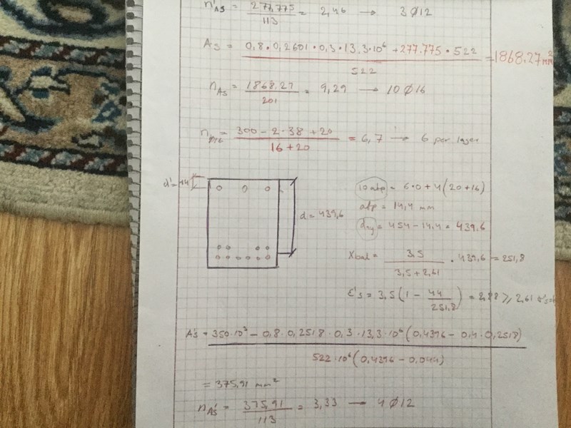 Conny 1000 tack för din hjälp,Nu blev det ännu mer lättare och förstå detta.Nu är jag på slut ändan på denna uppgift och jag lägger ut lösningen på nästan sista sidan.Som du ser uppifrån vi har räknat Antal stänger i bunt för överkantarmeringen och sedan har vi räknat Armeringsarean och Antal stänger i bunt för Armeringsarean.som du ser på figuren så har jag markerat 2 ställe.Den första är 10atp och andra är (d ny)?