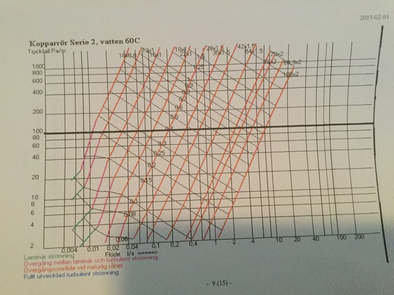 - därefter gå ner igen tills dess att man når första färgade linjen och detta markerar det rör som är passande i sammanhanget samt ger det tryckfall per meter som understiger 100Pa/m men som också är så smalt som möjligt i övrigt.