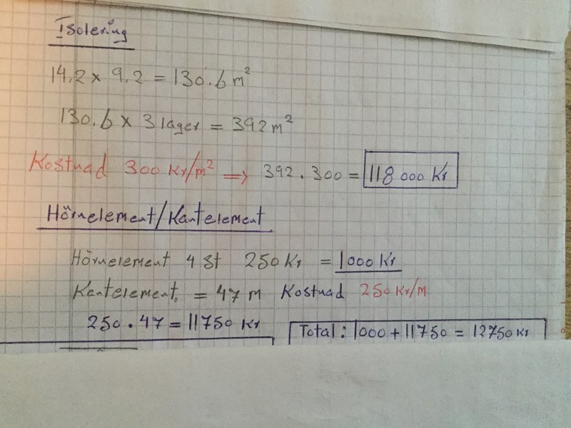 Affe detta va verkligen en gruv miss.Denna kostnad för Isoleringsmaterial 118000 kr.jag tyckte att det va väldig mycket pengar.men rätt är Kostnad 55kr/m^2 = 392 m^2 x 55 kr/m^2= 21560 kr som du sa.
