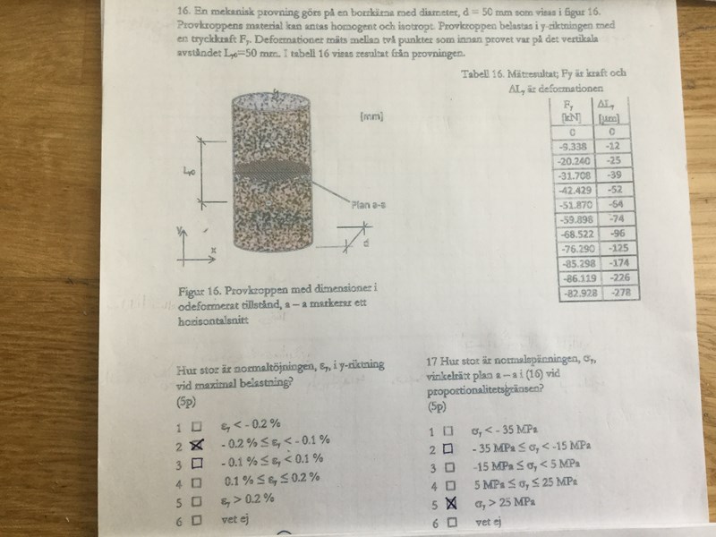 hej.Detta är en fråga på två olika delar.En mekanisk provning görs på en borrkärna med diameter,d=50 mm som visas i figur 16.Provkroppen material kan antas homogent och Isotropt.Provkroppen belastas i y-riktningen med en tryckkraft F.Deformationer mäts mellan två punkter som innan provet var på det vertikala avståndet L0=50 mm. I tabell 16 visas resultat från provningen.