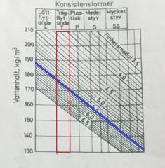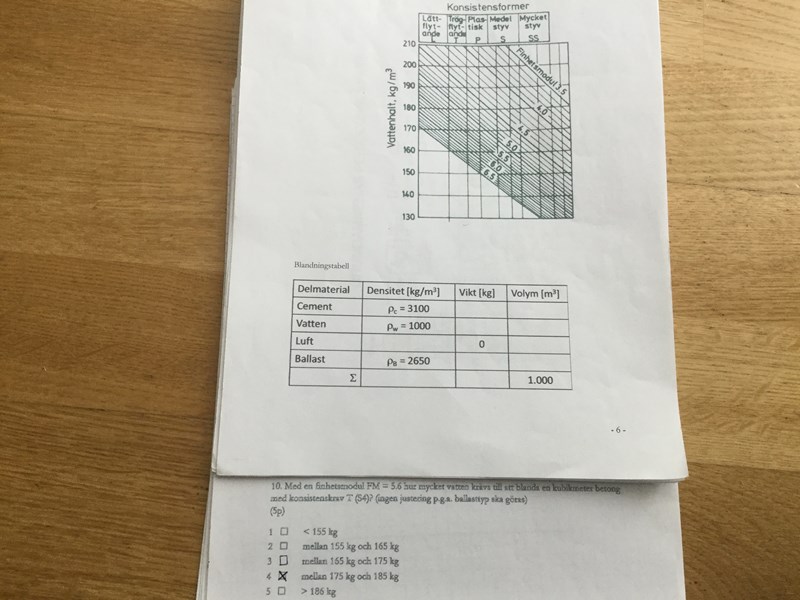 hej på fråga 10 på bilden ser vi Med en finhetsmodul FM=5,6 hur mycket vatten krävs till att blanda kubikmeter betong med konsistenskrav T (S4)?