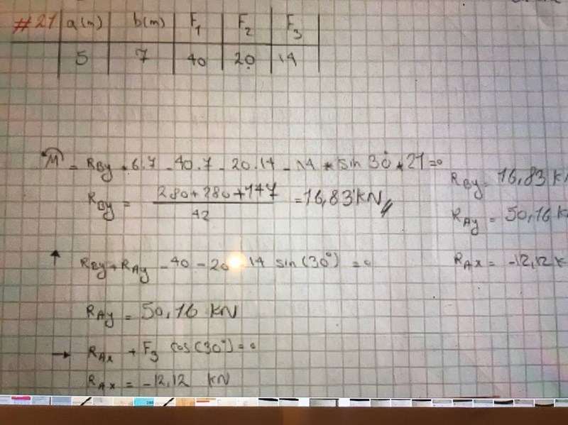 Jag undra hur har vi fått RAy= 50,16 KN och RAx= -12,12 KN i de ekvationer där nere ?
