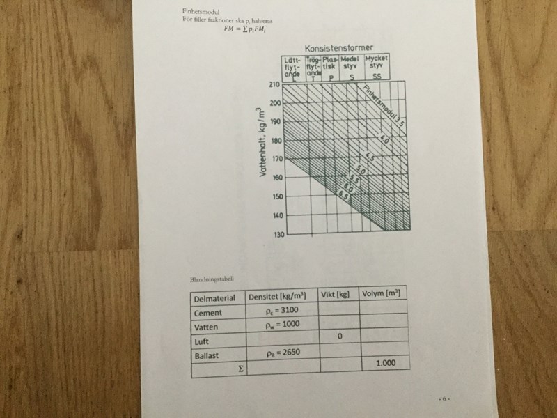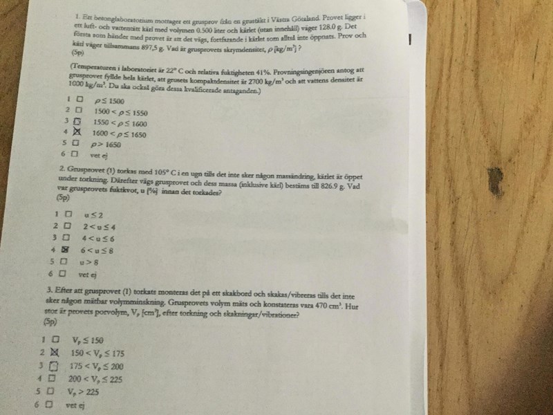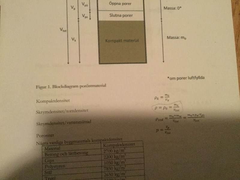 Jag förstår att på uppgift 1 för att få fram skrymdensitet (vattenmättad) är totala vikt m(o) + m(w) och total volymen v (tot) För materialet som står i Formelbladen