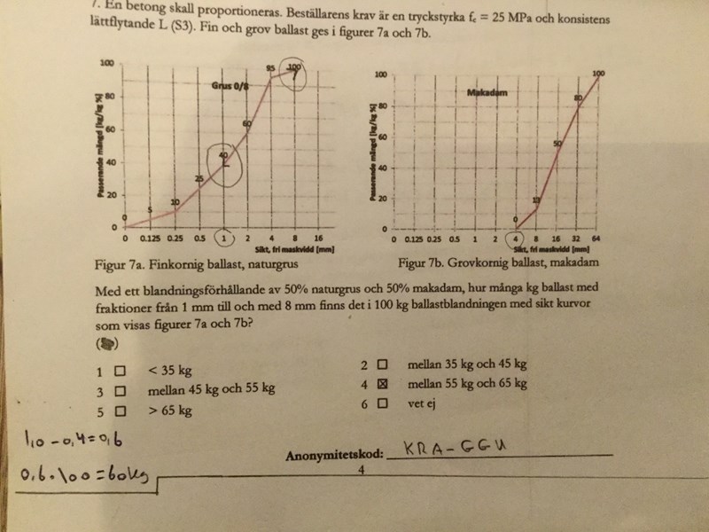 Om vi tolkar "... blandningsförhållande av 50% naturgrus och 50% makadam..." som viktprocent (vilket är det enda vi har att gå på i uppgiften) så betyder det att i 100 kg av ballastblandningen har vi 50 kg naturgrus och 50 kg makadam. Av 50 kg naturgrus är 40 % mindre än 1mm d.v.s. 60% är mellan 1 och 8 mm. Sedan har vi även 13% av 50 kg makadam som är mindre än 8 mm.