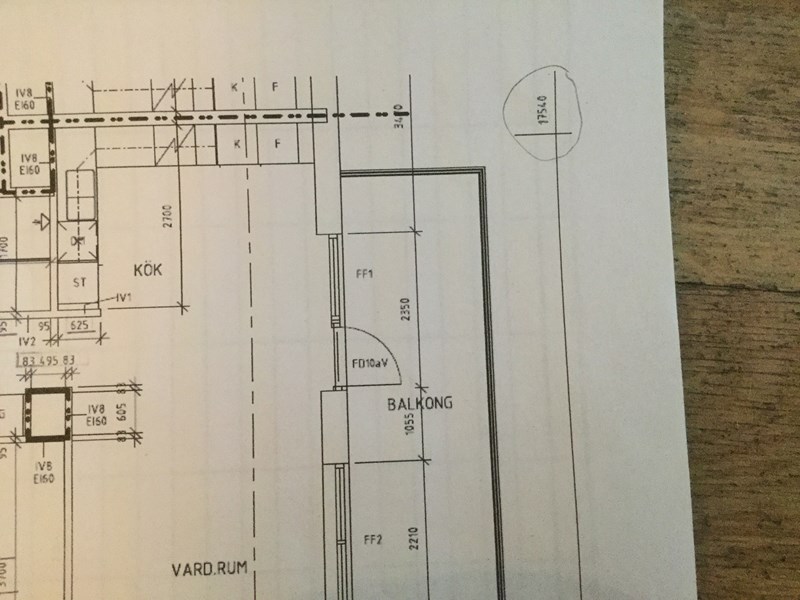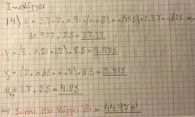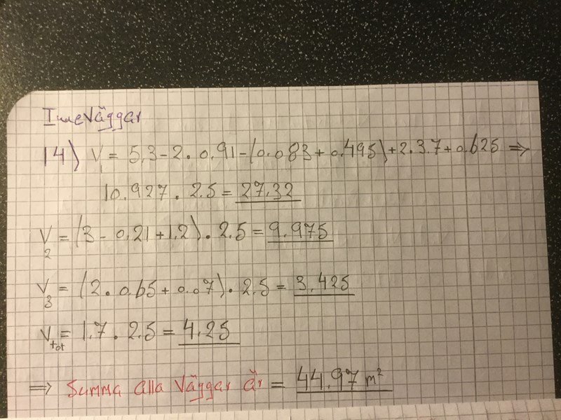 Nu har jag försökt zooma i dina suddiga bilder. Det tycks då finnas flera fel i beräkningar av vägg-längder. Jag får t.ex.