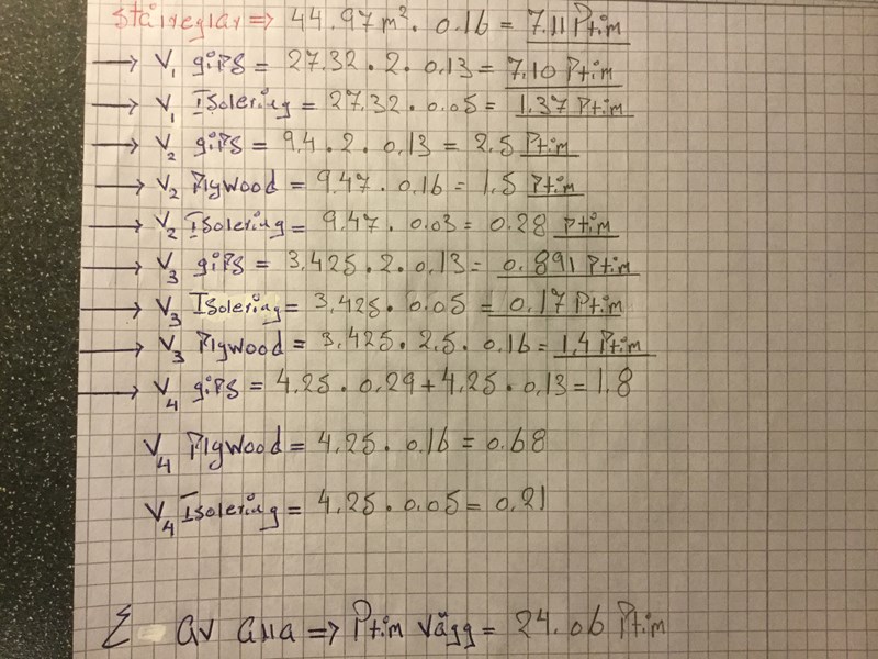 Affe,så Vägg 3 plywood är fel.så det blir 3,425 *0,16=0,548Ptim