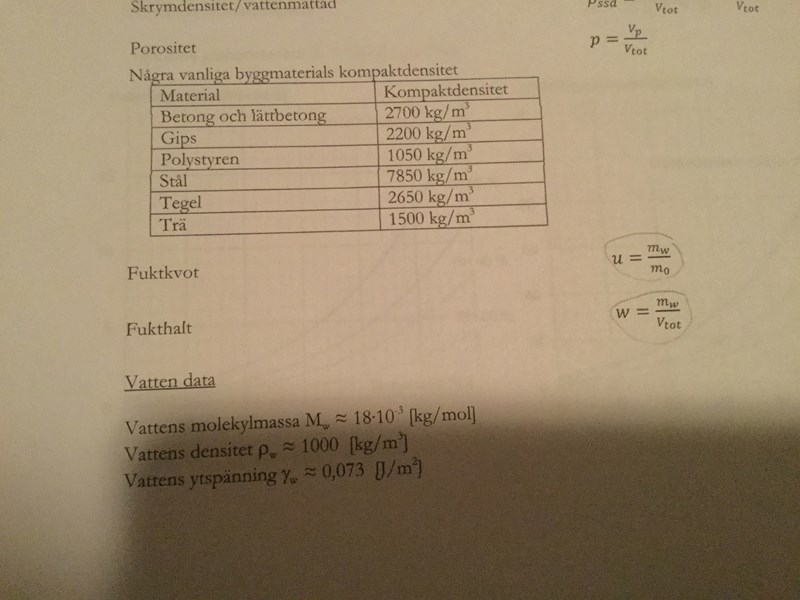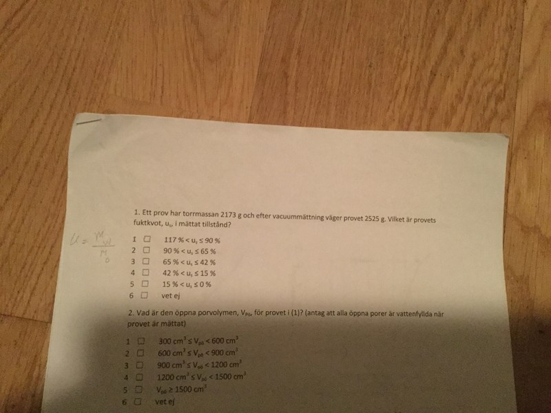Ett prov har torrmassan 2173 g och efter vacuummättning väger provet 2525 g.Vilket är provets fuktkvot.U i mättat tillstånd?
