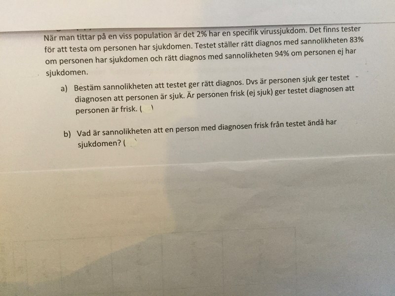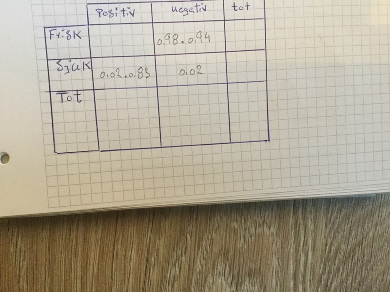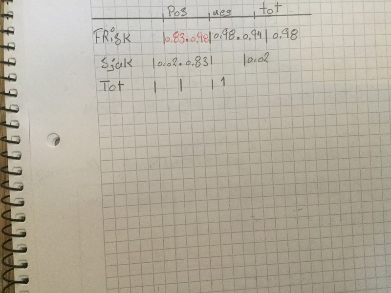 hej jag undrar om jag har räknat rätt positivt om du tittar i min tabell .0,83*0,98=0,81 är Frisk positiv. Är det rätt?