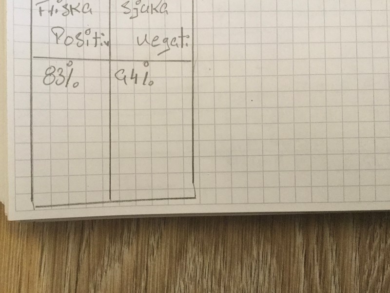Till att börja med, gör en riktig tabell. Med rutor ovanför varandra, inte min telefonversion 🙈 Sen vet vi ju att 94% av testen i översta raden var neg, då kan inte 83% vara pos, eller hur?