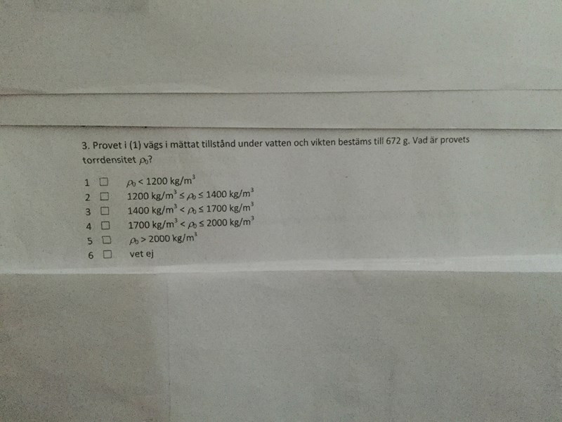 charlie2016 skrev:Jag hoppas att det inte gör nånting att jag lägger ut den:Vi har gått genom fråga 1 och 2 och fråga 3 är fortsättning på 1.Det är så mycket regler här i pluggakuten.Det vi behöver veta är provets TorrDensitet