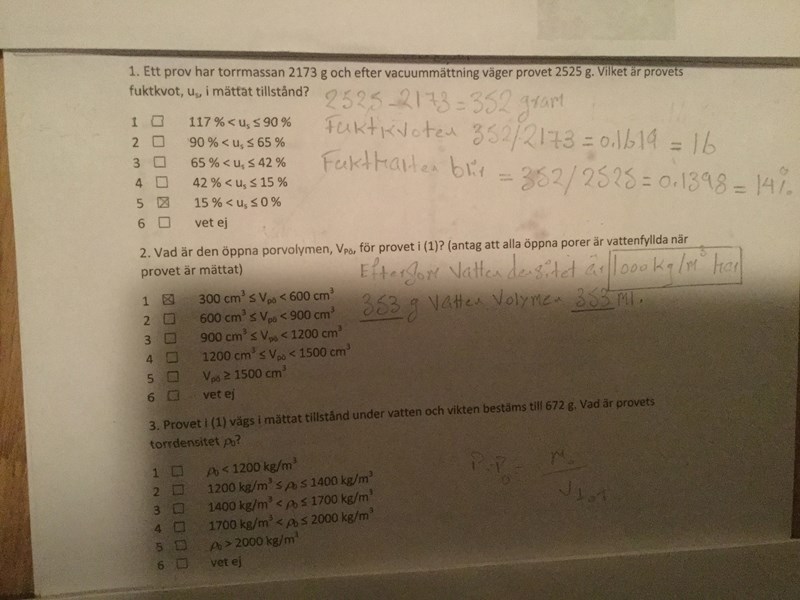 Jag hoppas att det inte gör nånting att jag lägger ut den:Vi har gått genom fråga 1 och 2 och fråga 3 är fortsättning på 1.Det är så mycket regler här i pluggakuten.Det vi behöver veta är provets TorrDensitet