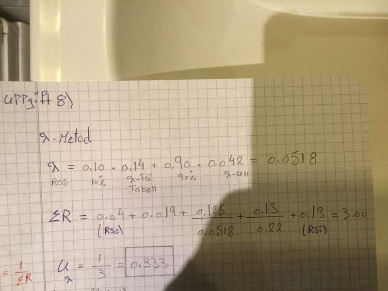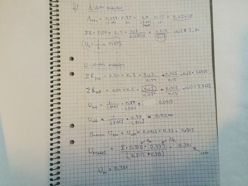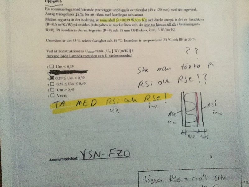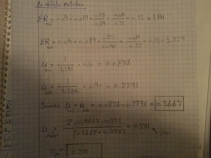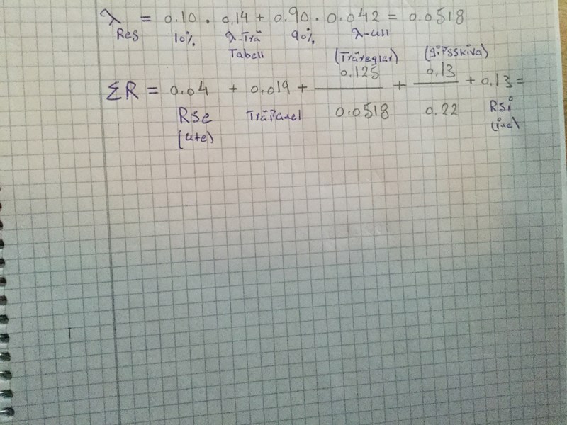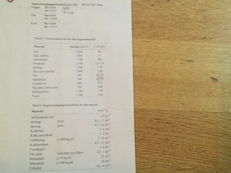 jag skulle behöva hjälp med några värde på uppgift 8)som ni ser jag har markerat med röd penna?jag hoppas ni förstår vad jag menar.I uppgift 6) vi använde oss av (R=0,5 m^2 k/W)Fasadskiva på utsidan.Vilket värde är det på uppgiften 8)?Är det 19 mm Fasad av liggande träpanel eller 38x125 mm träreglar eller 13 mm gipsskiva vi använder oss av?mvh