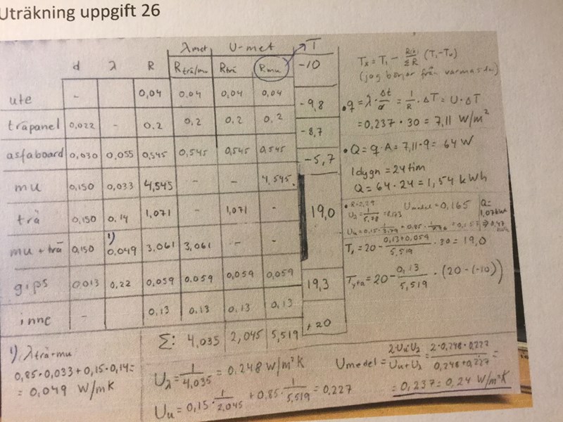 man skall beräkna R för varje delsskikt i vägge. Och summera R enl Lambda-redo U-värdesmetoderna vilket ger två extremer av U-värde för väggen sedan beräkna det korrigerade U-värde enligt en formel.Ekvationen(Formeln) för U-medel=funktion ( U-u,U-lambda) finns i formelsamlingen på övningstentan.Att ta fram de två U-värdena är inte att Fylla i Formeln utan att räkna en hel tabell sida där varje delskikt är en rad och olika indata eller beräkningar är kolumnerna.