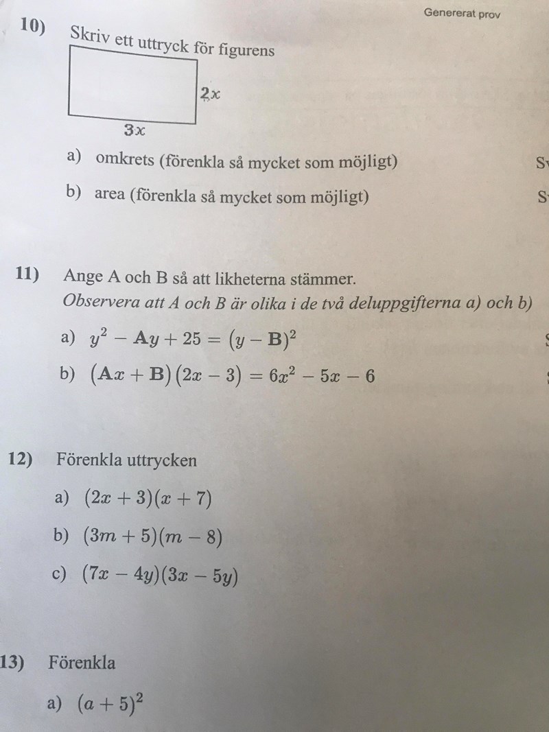 Tips: Använd en kvadreringsregel baklänges på VL i a-uppgiften. Vad måste A ha för värde för att detta skall kunna fungera? Sedan hittar du nog vilket värde b har. Multiplicera ihop parenteserna i b-uppgiften och jämför koefficienter. Eller kolla direkt - måste vara lika med 6, och måste vara lika med 6 för att VL skall kunna vara lika med HL.