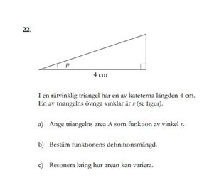 AndersW skrev:Triangelns area A = bh/2 eller hur. Du har b. Hur kan du med hjälp av b och vinkeln beskriva höjden (det vill säga den andra kateten)?