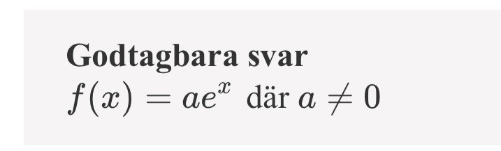 Jag håller på med denna uppgift som du kan se nedan. Jag förstår inte riktigt hur man går tillväga för att lösa denna uppgift. Jag har facit men det hjälper mig inte riktigt. Allt jag vet är att f(x) = f’(x) endast gäller för e och inget annat. Jag uppskattar all hjälp!