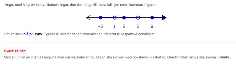 Ja, det funkar också. Men kom ihåg att du även skulle ha med oändligheten enligt den sista rubriken "Svara så här". Om jag ger dig ett till tips, oändlighet är inte ett tal, kan man då inkludera det i intervallet? Kan man exempelvis skriva -5<x<= infinity, är det skillnad på det gentemot -5 < x < infinity?